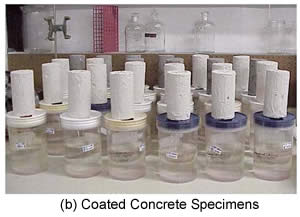 Dr. Vipu described tests conducted with coatings and/or sealers being added to inner surfaces of waste lift stations. There they were conducting in-situ product bonding and water vapor emission tests. Additional product testing included using concrete cylinders with 'holiday' pinholes drilled into the coatings, then coating and/or sealing them and partially immersing them in assorted chemicals simulating environmental conditions. The cylinders were periodically removed, tested, and then returned to their test conditions for future bonding tests. He discovered the coating decay in lift stations closely matched simulation tests he conducted in the lab.