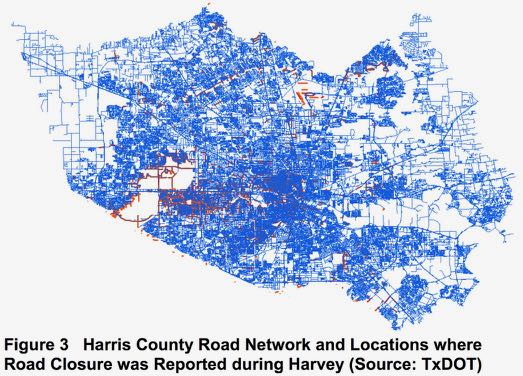 Figure 3 shows the road network in Harris County and the locations where TxDOT reported road closures during the hurricane Harvey.